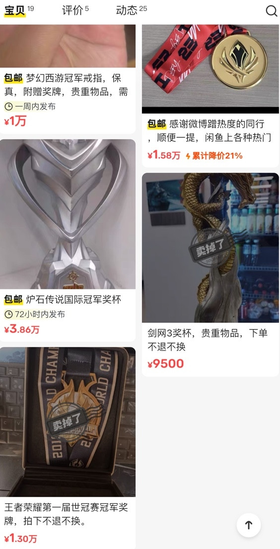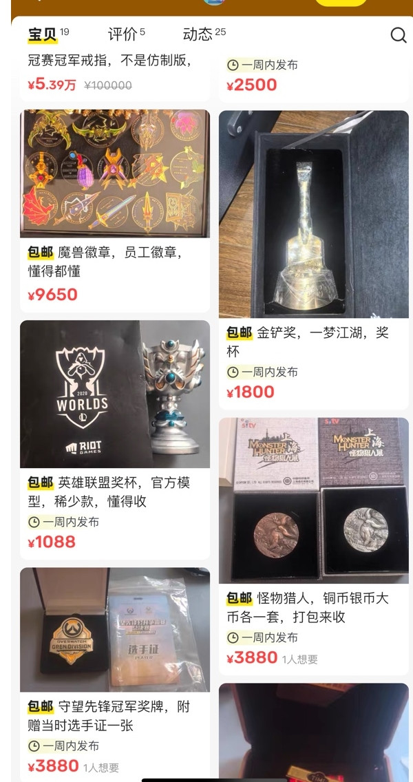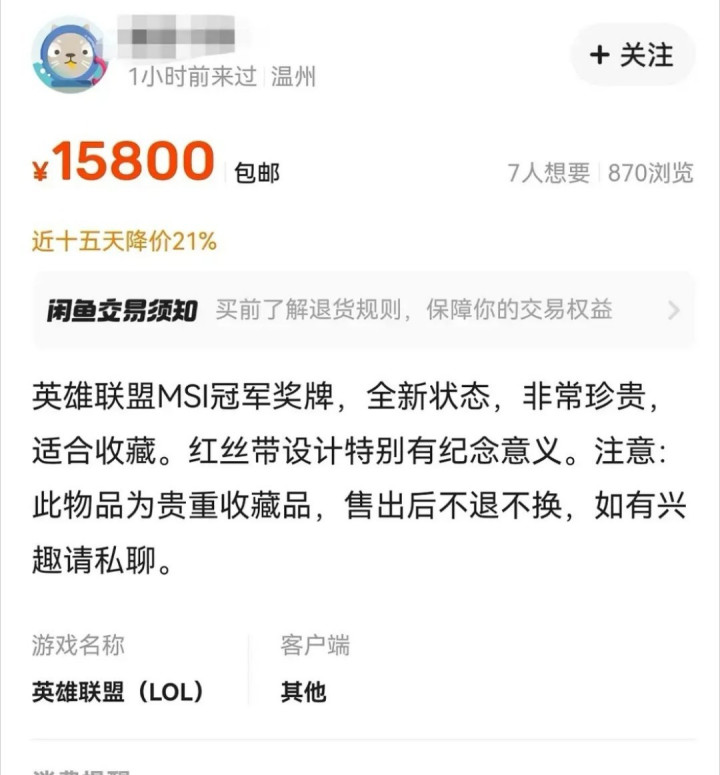 该账号除了MSI冠军奖牌外,还出售了王者荣耀世冠奖牌,梦幻西游20年戒指等稀有品。